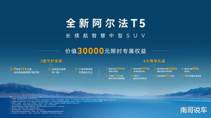 据了解,即日起下订新T5,用户还可以享受价值3万元限时专属权益,尤为“王炸”的是,极狐新T5重磅承诺“三电终身质保、电池自燃烧一赔一、8年或15万公里内电池衰减低于70%只换不修”,三重承诺同时给到,行业内只此一家。